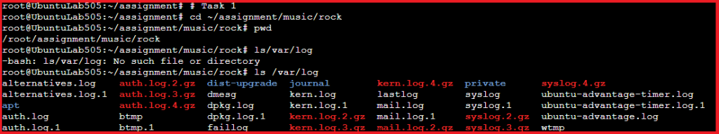Navigating directories using absolute paths. Commands used: cd ~/assignment/music/rock, pwd, and listing contents with ls /var/log.