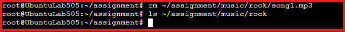 rm ~/assignment/music/rock/song1.mp3 → deletes the sample file